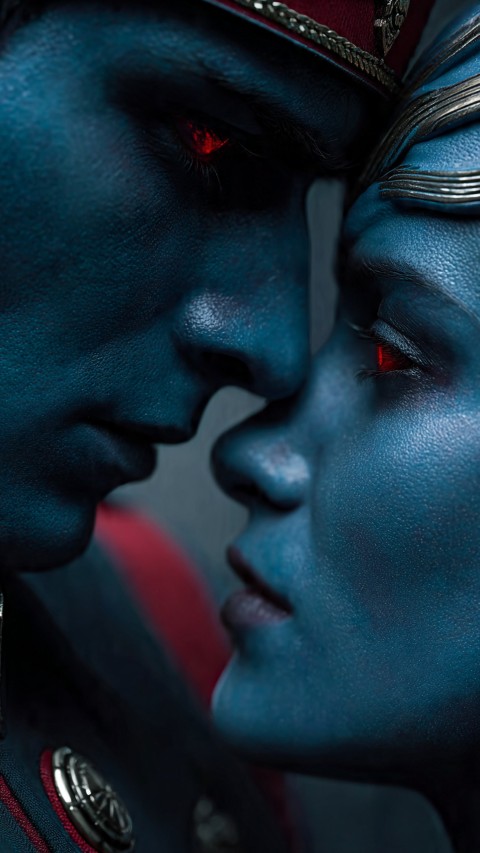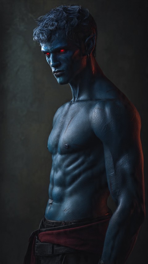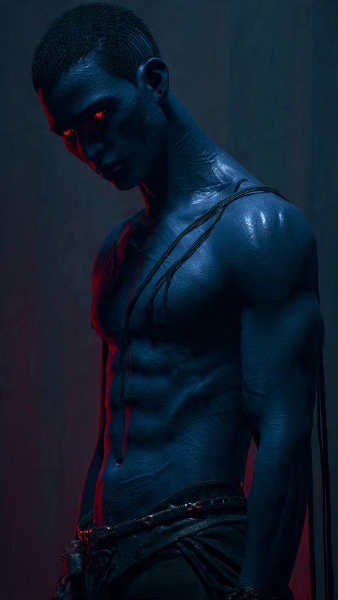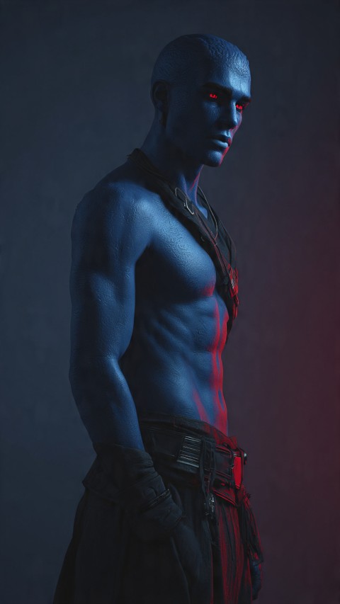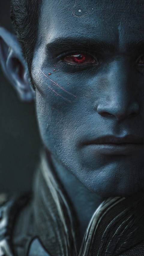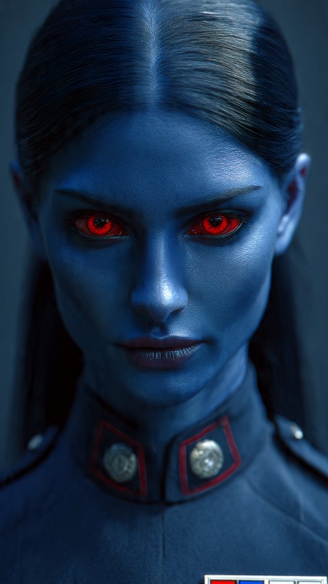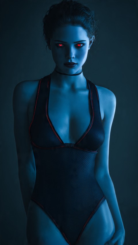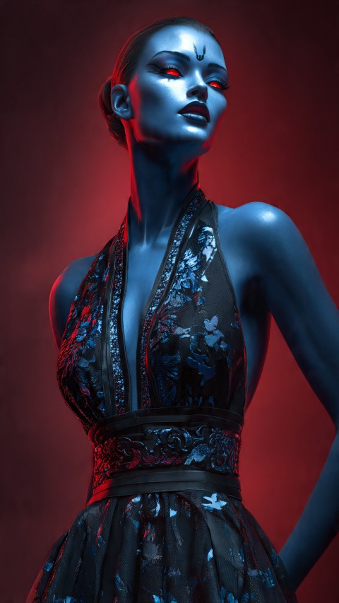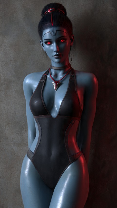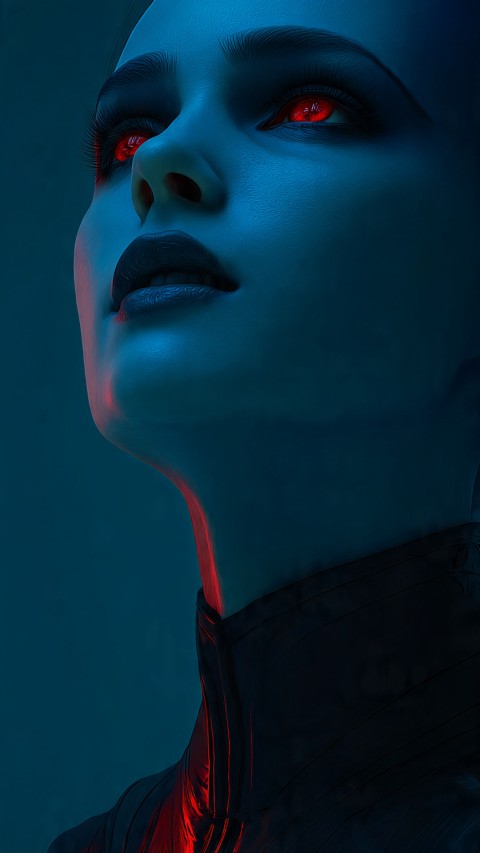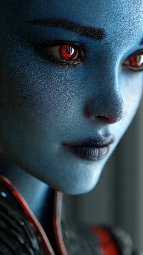Su piel, en tonalidades que van desde el azul pálido hasta el azul medianoche, sugiere una frescura y una pureza casi aristocrática. Pero el rasgo más magnético son sus ojos rojo encendido. Estos ojos no solo ven el espectro visual estándar, sino que brillan con mayor intensidad según su estado de ánimo, creando una conexión visual intensa y penetrante que puede ser intimidante y profundamente seductora a la vez.